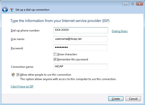 To connect, click on the Internet Explorer icon or click the Start button and then Connect to, then click the HiCap connection.